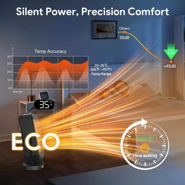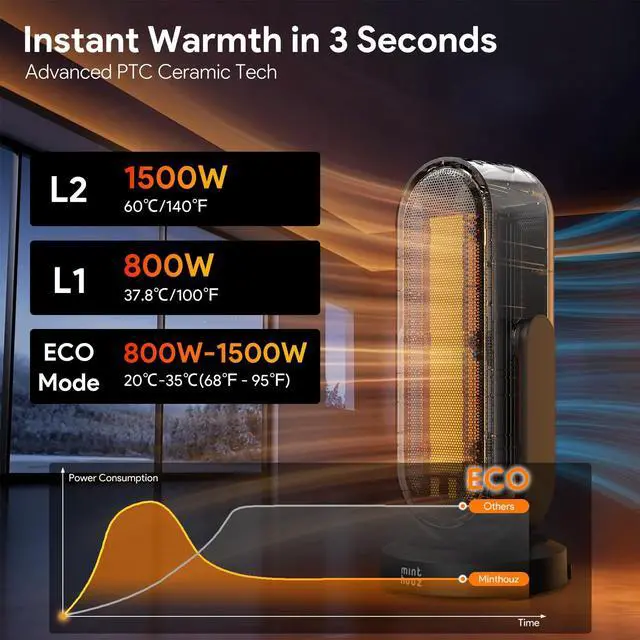 Specification: 1.Model: Sol H15 2.Material: ABS + PP + PA6 + Iron 3.Power: High-Heat (L2) 1500W / Low-Heat (L1) 800W High-Heat (L2) 1200W / Low-Heat (L1) 700W 4.Voltage: 120V/60Hz 230V/50Hz 100V/50-60Hz 5.Product Size: 18.2 * 18.2 * 41.6 cm / 7.2 * 7.2 * 16.4 in 6.Unit Weight: 2.3kg/81.1 oz 7.Power Cord: 1.8m 8.Horizontal oscillation up to 120 degrees. Vertical oscillation up to 45 degrees up and 10 degrees down. Features -With a high power of up to 1500W/1200W, it can heat up the room rapidly, bringing you warmth in 3s. -Smart ECO mode keeps the room at an optimal temperature while saving energy, meeting special user needs. -Tip-over & Over-heat protection ensure safe use, safeguarding users from potential hazards like fires and injuries. -Comes with an infrared remote control, allowing you to easily adjust settings from a distance. -Operates at a noise level of less than 45dB, ensuring a quiet and comfortable environment. -Allows users to set a shutdown time of 2/4/6/8H, saving energy and providing convenience, especially for overnight use. -Supports both up-down and left-right oscillation, spreading warmth evenly throughout the room. -With the compact size and lightweight, it's easy to move and place in different rooms. -V-0 Flame-Retardant Materials In the Box -1 x Electric Space Heater -1 x Remote -1 x Quick Start Guide Warm Tips: 1.Memory Function: Maintains last temperature and mode settings if power remains connected. 2.24-Hour Auto Shutdown: Turns off automatically after 24 hours of continuous use without any user input. 3.Overheat protection activates at ambient temperatures above 50°C/122°F. 4.Do not allow water to enter the heater, as this may pose a fire or electric shock hazard.
