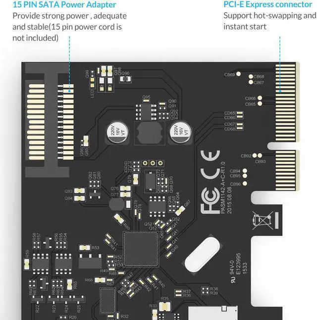Equipped with PCI-E SATA 15 Pin power connector, which provides strong power after plugging the power cord, compatible with most of chassis power. Supply power directly from PCI -E bus or 15-pin SATA power connector, which provide adequate and stable power for your USB devices. When using the 15-pin SATA power adapter connector, it supports up to 5V2A bus power on each USB3.1 port. 15Pin power cord is not included in package.