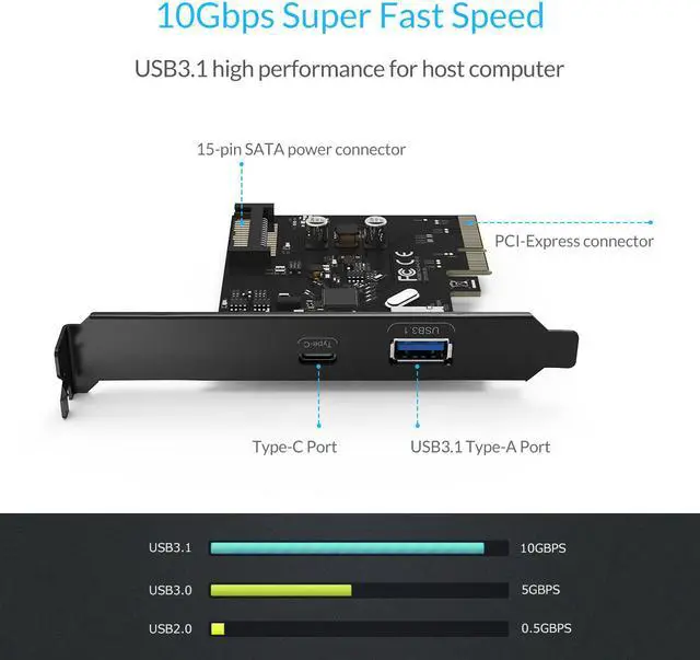 ORICO USB 3.1 Expansion Card lets you expand one USB 3.1 A port and one USB 3.1 Type-C ports for your standard desktop PC and support 2 devices operating simultaneously. Providing both super speed USB 3.1 Type-C and Type-A ports, ORICO USB 3.1 2-Port PCI Express Card is a simple and economical solution for adding the latest high speed 10 Gbps USB 3.1 ports to any desktop computers or servers. With USB 3.1 enables you to transfer videos, music, photos, data files between USB devices and the computer at enhanced transfer speed up to 10 Gbps.