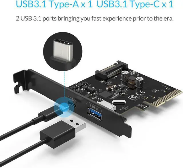 Easily add two USB3.1 ports to your desktop PC, Superspeed+ USB 3.1 supports up to 10Gbps data transfer rate, twice as fast as USB 3.0, 20 times faster than USB 2.0, and backwards compatible with USB 3.0 / USB 2.0 / USB 1.1. The PCI-E port fits in any PCI-E x4 x8 or x16 slot. The card offers USB-C and USB3.1-A ports, so you can bridge the gap between older and newer USB devices that use different connectors.
