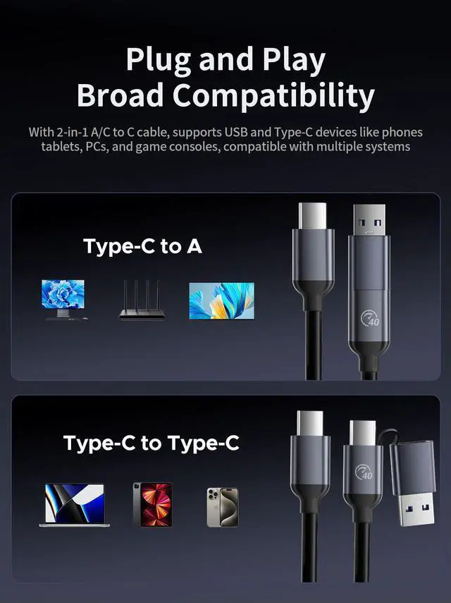 Transmission Speed: Actual transmission speed may vary based on SSD, data cables, and connected devices (ensure all components support 40Gbps for maximum speed).
