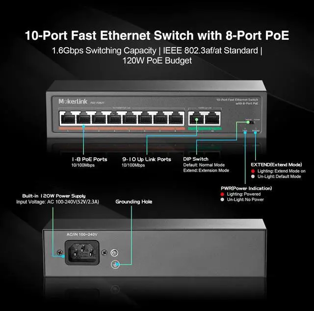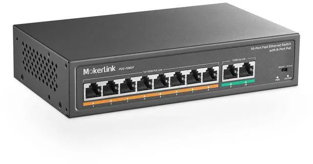 - 8*10/100Mbps PoE ports + 2* 10/100Mbps Ethernet Uplink ports.