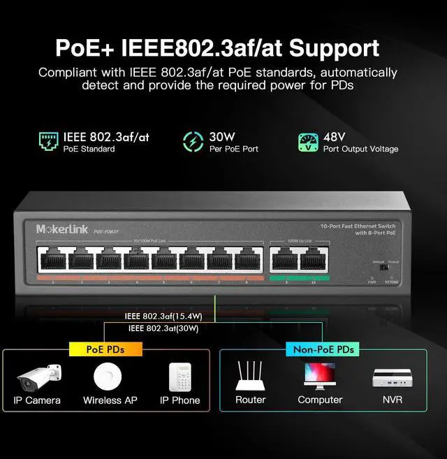 10-port fast ethernet poe switch using high-quality high-speed network IC and the most stable PoE chip, PoE Port support IEEE802.3af/at standard, The network provides a seamless connection, and the PoE power port can automatically detect and power the powered devices that comply with the IEEE 802.3af or IEEE802.3at standards. The non-PoE device intelligently detects no power and only transmits data.