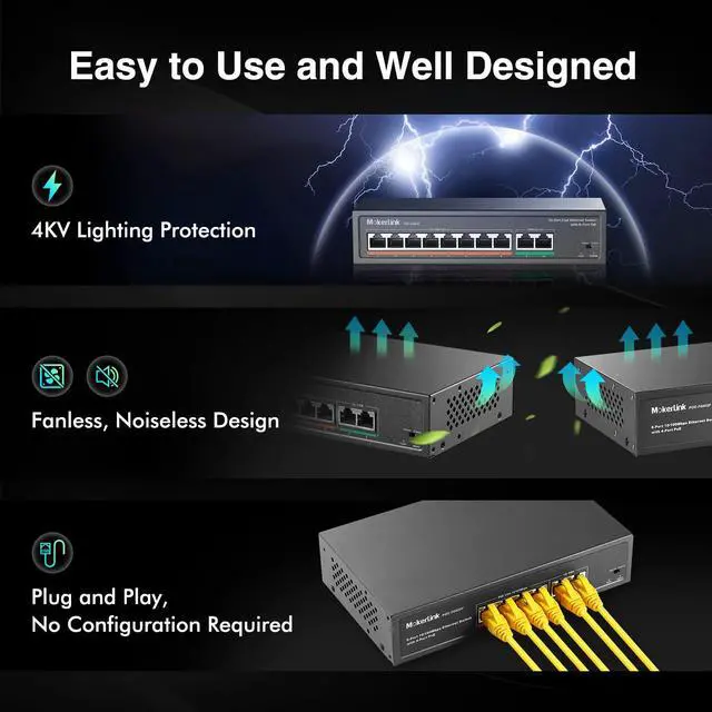 10 port PoE switch support installation plug and play. No configuring is required. Auto MDI/MDI-X crossover on all ports eliminate the need for crossover cables or uplink ports. Auto-negotiation on each port senses the link speed of a network device and intelligently adjusts for compatibility and optimal performance.