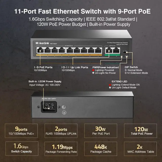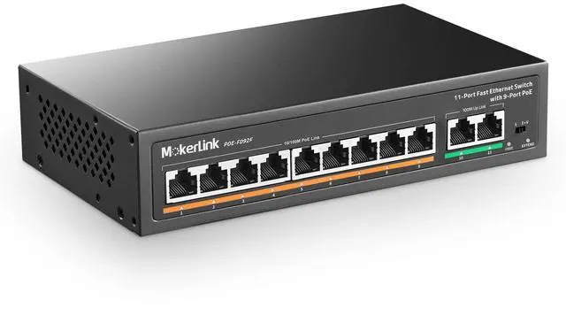 - 9*10/100Mbps PoE ports + 2* 10/100Mbps Ethernet Uplink ports.