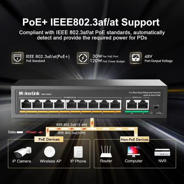 11 port PoE switch support installation plug and play. No configuring is required. Auto MDI/MDI-X crossover on all ports eliminate the need for crossover cables or uplink ports. Auto-negotiation on each port senses the link speed of a network device and intelligently adjusts for compatibility and optimal performance.
