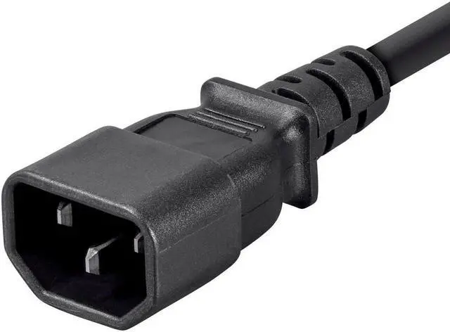 Save an AC power outlet by connecting your computer monitor to the computer power supply or extend a cable with an IEC 60320 C13 connector on one end. This cable features a female IEC 60320 C13 connector on one end and a male IEC 60320 C14 plug on the other end. Simply mate the male C14 connector to another cable with a female C13 connector. Alternatively, mate the male C14 connector to the C13 panel connector on a computer power supply then mate the female C13 connector to a male C14 connector on a monitor or monitor AC power adapter.