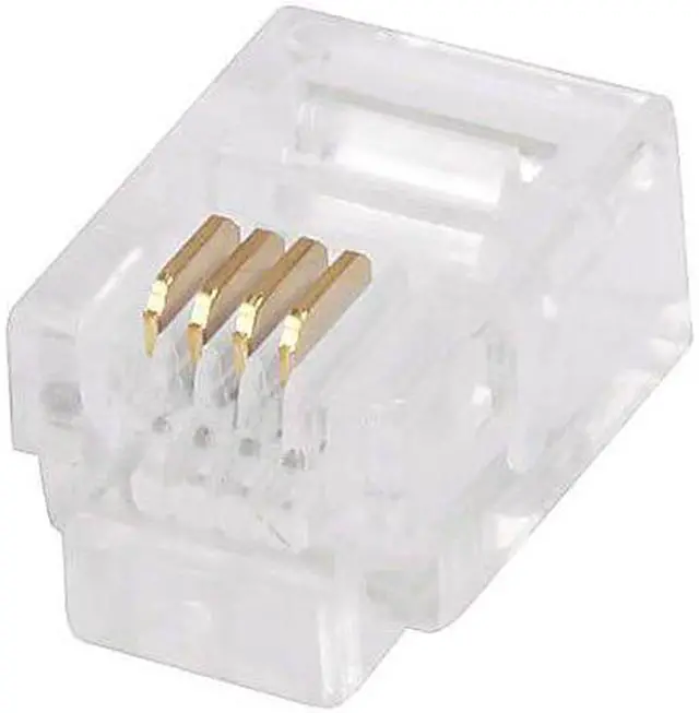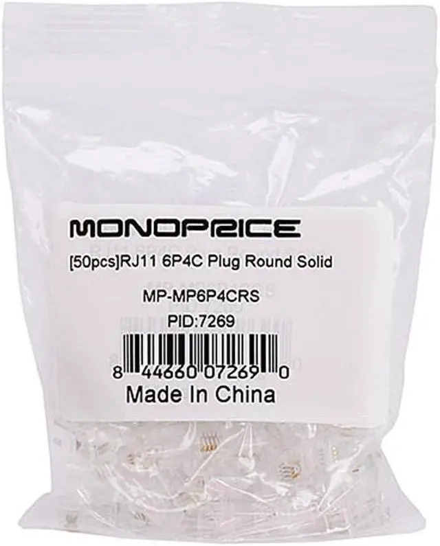 RJ11 connectors for 4 Conductor, Solid Wire, Round Phone Cables. Crimp on RJ11 connectors. 4 conductor type. Clear plastic housing. For Solid wire round cables. *Monoprice continually strives to improve its product line to bring our customers the best products available. Therefore, changes may be made to listed specifications without prior notice. Item received may not match photo or specs shown.