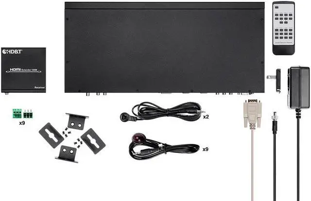 The complete kit includes an HDBaseT receiver, two wideband IR receivers, and nine wideband IR transmitters.