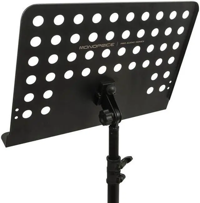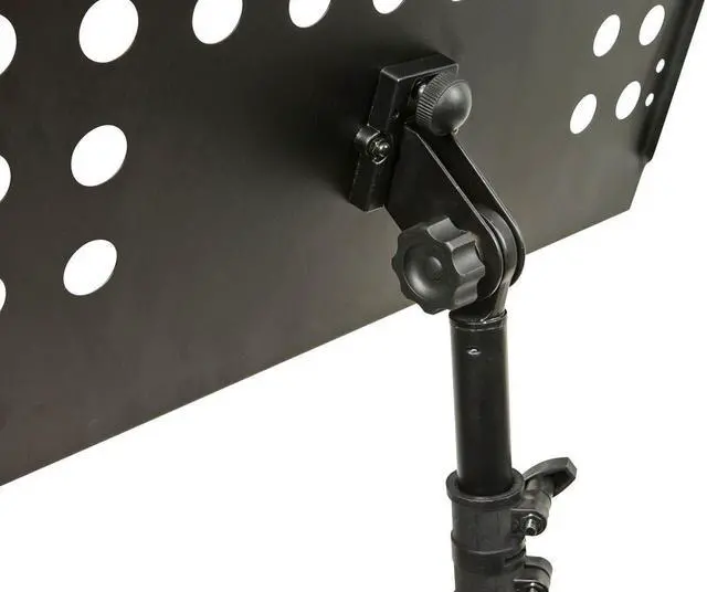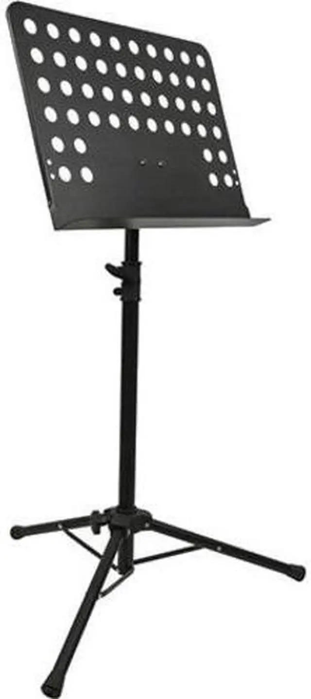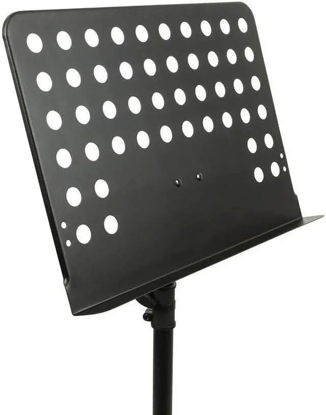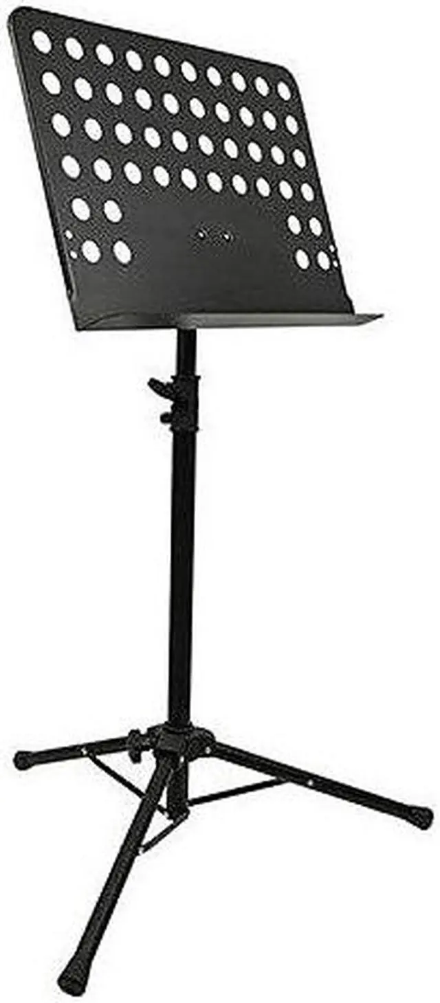 This heavy-duty music stand features a perforated desk that measures 18.8" wide, 13.6" tall, and 1.9" deep. The base of the desk can be positioned between 26" ~ 46" above the floor. The three-legged base measures about 23.5" between feet. *** 30-day easy returns. No restocking fee. Free lifetime technical support. 1 year warranty. ***