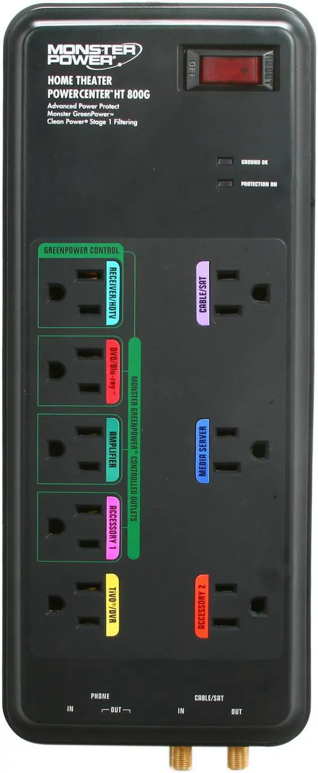 Complete Protection for All ConnectionsAll of a component’s inputs and outlets need to be protected, or the entire system will be vulnerable. Dangerous surges and spikes can travel on your coax connections to damage your AV equipment. The Monster MP HT 800G features comprehensive protection with coax and phone connections to keep all your connected equipment safe.