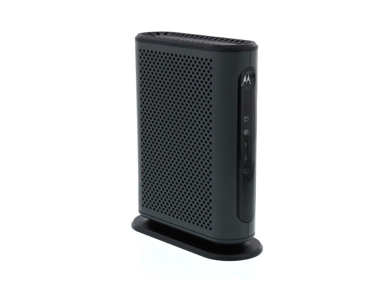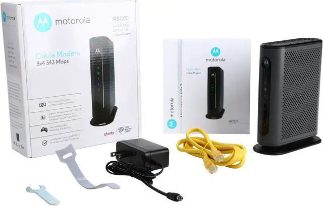Model MB7220 is an 8x4 343 Mbps DOCSIS 3.0 cable modem certified by a number of leading cable service providers including Comcast XFINITY, Time Warner Cable, Cox, and BrightHouse. With easy installation, high-speed, broad compatibility, and superb customer support, Model MB7220 is the perfect choice for almost any cable modem user. 8 X 4 means that up to 8 cable data channels carry data from the Internet, eight times faster than DOCSIS 2.0; and up to 4 channels carry data to the Internet. A Full-Band Capture digital tuner helps assure consistently fast speeds from your service provider. A 10/100/1000 Gigabit Ethernet (GigE) port allows connection of a computer, router, HDTV, game station, or other Ethernet-capable device. Setup is fast and easy with a few quick steps set out in a Quick Start guide. Experienced USA-based customer support specialists are ready and willing to help if you need them. Model MB7220s compact, attractive design saves space and looks good in any home or office. This product is backed by a two-year warranty and features ruggedized lightning and power surge circuits to provide additional protection of your investment. DOCSIS 3.0, 2.0, and 1.1 support and CableLabs certification ensure compatibility with cable services nationwide. Best of all, the MB7220 offers the value, performance, and attention to quality that continue to make Motorola the leading brand of cable modems. Please note that the MB7220 plugs easily into computers, HDTVs, and other Ethernet-capable devices including any router of your choice, but the MB7220 does not have a built-in router. Motorola Model MG7310, for instance, has both a cable modem and a built-in router.