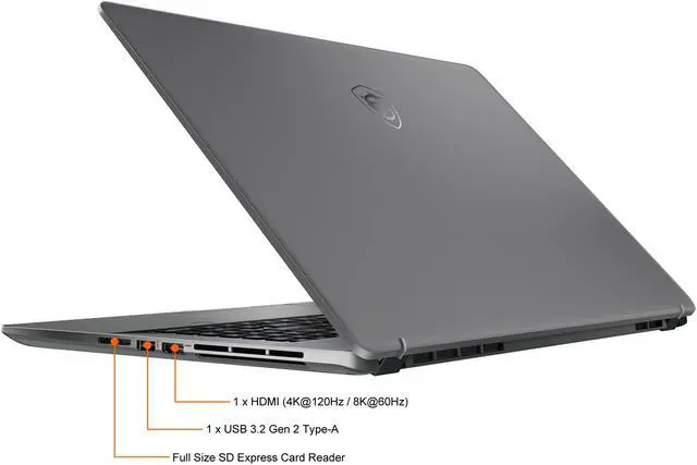 Creator Z17 offers a full set of high-performance I/O ports. Thunderbolt 4 offers connectivity with state-of-the-art speed and versatility, supporting up to 40Gbps bandwidth with daisy chain capabilities. With SD Express high speed card reader, save more time when transferring your high-quality videos. Creator Z17 provides that extra flexibility to save and share your incredible ideas while staying mobile.