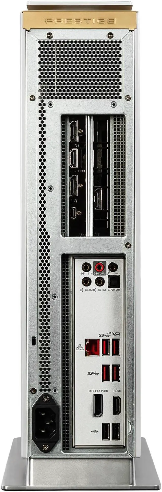 a white Prestige P100 desktop PC with many app screenshot