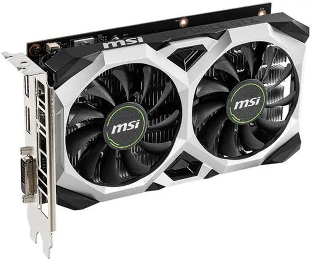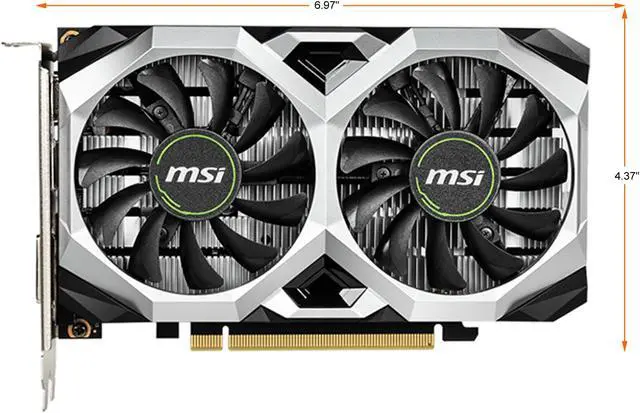 This MSI card is factory-overclocked to 1695 MHz Boost Clock (1665 MHz Boost Clock for GDDR5 reference card). Dual large fans keep things cool even under heavy load, and DVI, HDMI and DisplayPort outputs offer seamless compatibility with modern display devices.