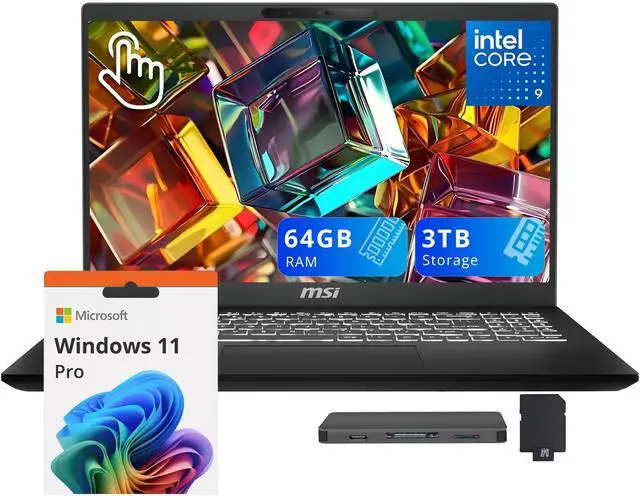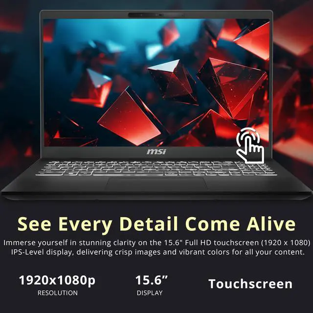 MSI Modern 15 15.6" FHD Touchscreen Laptop delivers sharp, clear visuals and reliable performance with the Intel Core 9 270H Processor and Intel Graphics, featuring a backlit keyboard and numeric keypad for comfortable, efficient productivity.