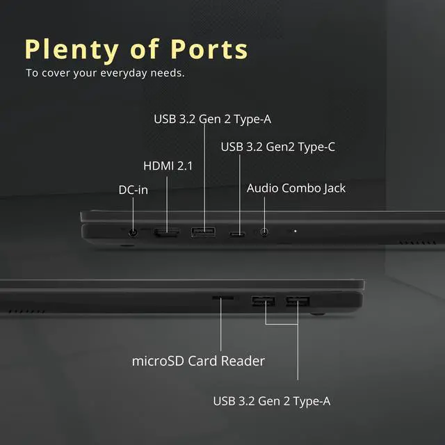 Windows 11 Pro: 14.1" x 9.5" x 0.78", 4.19 lbs. Ports: 1x USB-C, 3x USB-A, 1x Audio Combo jack, 1x HDMI 2.1, 1x microSD Card Reader, 1x DC-in, Wi-Fi 6E + Bluetooth 5.3. Bonus Docking Station Set: 1x 7-in-1 Docking Station w/ 1TB Storage, 1x 32GB MicroSD Card w/ Adapter, 1x Type-C Data Cable, 1x 3-in-1 Charging Cable, 1x Suede Cleaning Cloth.
