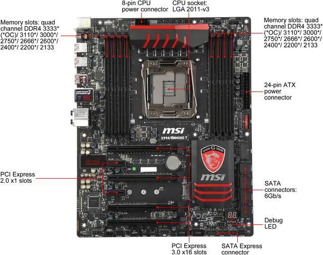 | Features | Supports New Intel Core i7 processors Extreme Edition in LGA 2011-3 socket Supports Quad Channel DDR4-3333(OC) Memory USB 3.1: Delivering speeds up to 10Gb/s, USB 3.1 offers performance twice as fast as a regular USB 3.0 connection Turbo M.2: delivering next generation M.2 Gen3 x4 performance with transfer speeds up to 32Gb/s SATA Express + USB 3.1 + SATA 6Gb/s Multi-GPU: Quad NVIDIA SLI & AMD CrossFire Support OC Engine: Reach higher overclocking results with more flexible BCLK adjustments at 100/125/167MHz Audio Boost 2: Reward Your Ears with True Quality Killer Ethernet: Kill Your Lag USB Audio Power: Super Stable 5V Power & Better Signal Transmission over USB XSplit Gamecaster: Show off you skills to the world with a six month premium license for this popular streaming software Guard-Pro: Improved Protection and Power Efficiency OC Genie 4: Overclock in 1 Second Gaming App: Boost your framerate Click BIOS 4: Easily Fine-tune Your System Sound Blaster Cinema 2: Benefit from Creative software to get a more realistic surround sound experience Gaming Device Port: Optimized with Triple Gold-plating for High Polling Rate Gaming Devices |