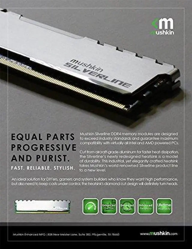 Mushkin Silverline DDR4 memory modules are designed to exceed industry standards and are built for maximum compatibility with virtually all Intel and AMD-powered PCs.