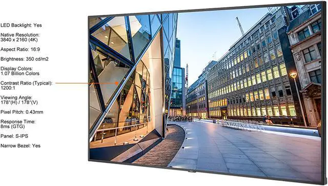 | Feature | 4K UHD native resolution allows for crystal clear imagery and messaging that become more vivid and lifelike than ever before! Landscape and Portrait orientation allows for flexibility of installation dependent on your needs. Future proof modular design options including the ability to integrate an Open Pluggable Specificaiton (OPS) device. Industrial-strength, premium-grade panel with additional thermal protection, internal temperature sensors with self-diagnostics and fan-based technology, allows for hassle-free 24/7 operation. Integrated Media Player allows for audio, video or image playback via USB. Failover Capabilities with full Input Detect functionality allow peace of mind as the display will automatically switch to a secondary or tertiary source if the primary source fails. Integrated Ambient Light Sensor allows the display to automatically adjust its luminance based on extenal brightness conditions. NaViSet Administrator 2 free software solution that greatly eases administration and management of larger display device installations. |