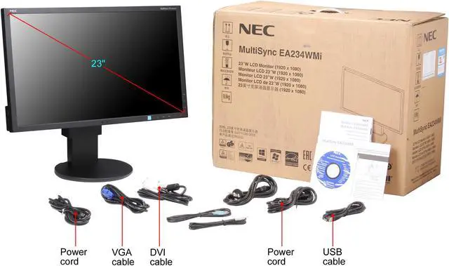 The 23" NEC MultiSync EA234WMi is an LED-backlit desktop monitor ideal for corporate environments. Designed to enhance work performance, this widescreen model features IPS panel technology with wide viewing angles and ergonomic adjustability. The LED backlighting of the EA234WMi allows for a slimmer profile, lighter weight and increased power savings compared to previous generation models. ControlSync™ technology allows users to control up to six EA234WMi displays in a multi-monitor configuration. Smart sensing technology automatically detects your work conditions to determine the proper display brightness with ambient light and human sensors, while a comprehensive input panel, including HDMI, DisplayPort, DVI-D, VGA and 4-port USB hub, connects users to the latest peripherals and future-proofs the investment.
