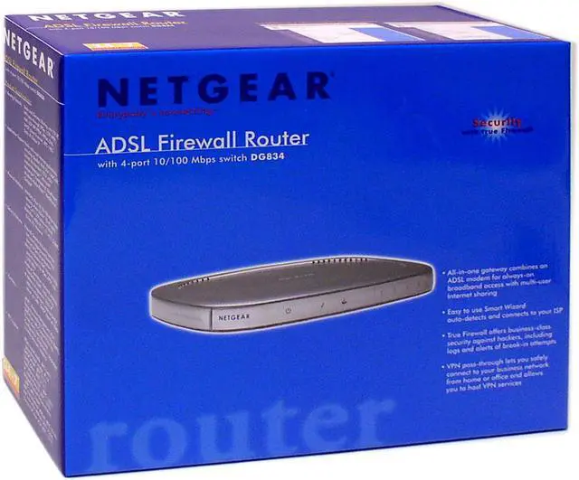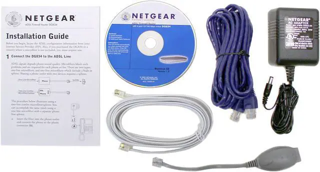 | Package Contents | ADSL Firewall Router DG834 Power adapter Vertical stand Ethernet cable Phone cable ADSL phone line filter(most countries) Resource CD Installation guide Warranty/Support information card |