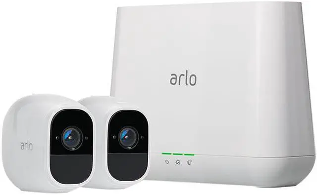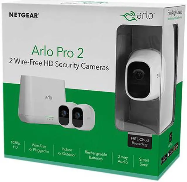 2 x Wire-Free HD Cameras with Audio 2 x Rechargeable batteries 1 x Camera power adapter 1 x Camera power cable 1 x Base station with a built in siren 1 x Ethernet cable 2 x Wall mounts 1 x Wall mount screw set 1 x Quick start guide 1 x Window decal