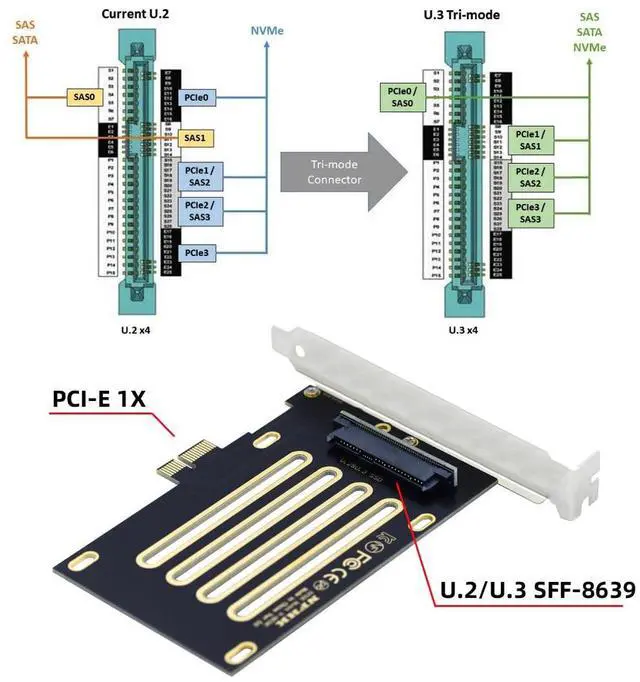 U.3 is a Tri-mode standard, building on the U.2 spec and using the same SFF-8639 connector. It combines SAS, SATA and NVMe support into a single controller. Where firmware support is available, U.3 can also support hot-swap between the different drives.