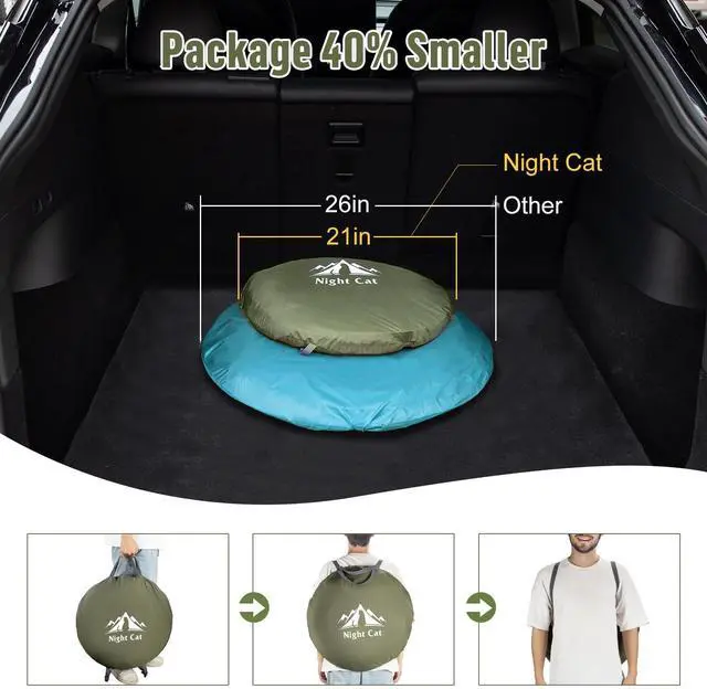 • [Package 40% Smaller]Weight:1.5kg, Package size:21x21x2in. Tranditional pop tent fold in 3 circles while Night Cat Upgraded Pop up Tent fold in 4 circles narrowing the radius of circle to make it 40% Smaller in package. Hand strap and 2 back straps is convenient to carry the foldable tent