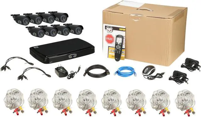 1 x 8 Channel AHD DVR with Pre-installed 1TB Hard Drive 8 x Indoor/Outdoor AHD 720p Cameras 8 x 60 ft. Bundles of Camera Cable 24 x Mounting Hardware and Screws 1 x 6 ft. HDMI Cable 1 x RJ-45 Cable (Ethernet) 1 x USB Mouse 1 x Remote Control (Includes Batteries) 1 x Software CD 1 x Quick Setup Guide 2 x DC 12V Camera Power Adapters 1 x DC 12V/2A DVR Power Adapter 2 x 4-Way Camera Power Splitters 3 x Night Owl Security Stickers