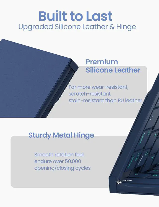 Crafted for longevity, the keyboard's back features premium silicone leather, which outperforms PU leather in wear, scratch, and stain resistance. No matter the usage scenario, it maintains its pristine condition over time. The sturdy metal hinge, designed for smooth rotation, can endure over 10,000 opening and closing cycles. Paired with strong magnetic attraction, it ensures the keyboard folds securely and stays protected.
