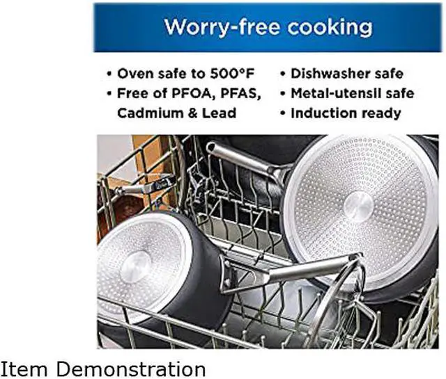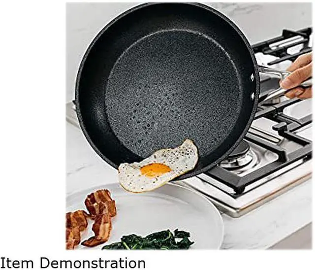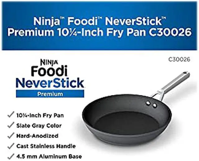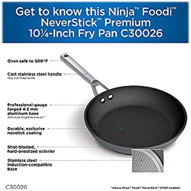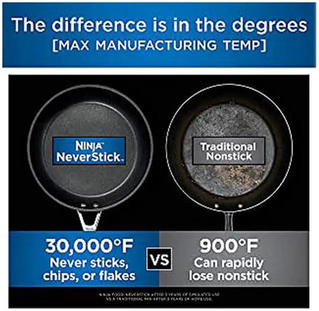 | Features | This premium cookware will never stick, chip, or flake The difference is in the degrees. NeverStick cookware is created at a max temperature 30,000°F. Traditional nonstick cookware is created at a max temperature 900°F, so they can rapidly lose nonstick NeverStick technology ensures the durable, textured Ninja exclusive nonstick coating is metal utensil safe and enables excellent food release day after day without sticking. Shot blasted, hard-anodized exterior is stronger than stainless steel Handle and nonstick coating are both oven safe up to 500°F. Easily go from stovetop to oven to finish cooking meats, brown toppings or bake like you can in cast iron Forged aluminum design uniquely distributes metal thickness throughout the pan for even heat distribution and hot-spot prevention, so food cooks quickly and evenly This medium frying pan is dishwasher safe. Free of PFOA, PFAS, cadmium and lead. All range capable like gas, electric, glass ceramic, and induction Sear like you can in stainless steel, plus sauté, griddle, pan fry, bake, roast, broil. No need to cook with oil or butter Stay-cool, cast solid stainless steel handle allows for oven use up to 500°F and is ergonomically designed. Double-riveted for strength and maneuverability Designed to withstand high heat cooking and aggressive scrubbing |
