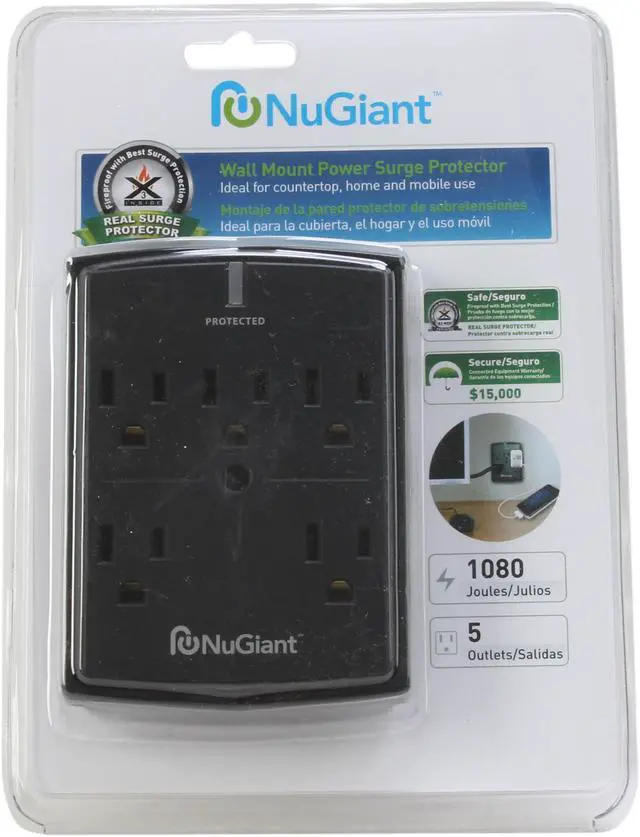 | Features | 5 Outlets Surge Protection with Wall Tap Style 2 transformer spaced outlets Built-in Patented Fireproof X3 MOV for maximum safety 1080J with Auto Shutdown LED Protect indicators Included $10,000 Connected Equipment Warranty Response Time: < 1 Nanosecond Max. Spike Voltage: 6KV |