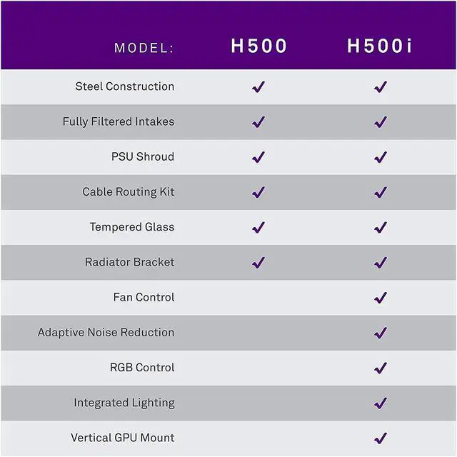 The H500 showcases the signature design of the NZXT H Series cases. The elegant all-steel construction includes the iconic cable management system to streamline building and upgrading your system. You can easily build a powerful system with plenty of options for storage and cooling. The H500 includes two Aer F* fans and a seamless tempered glass side panel.