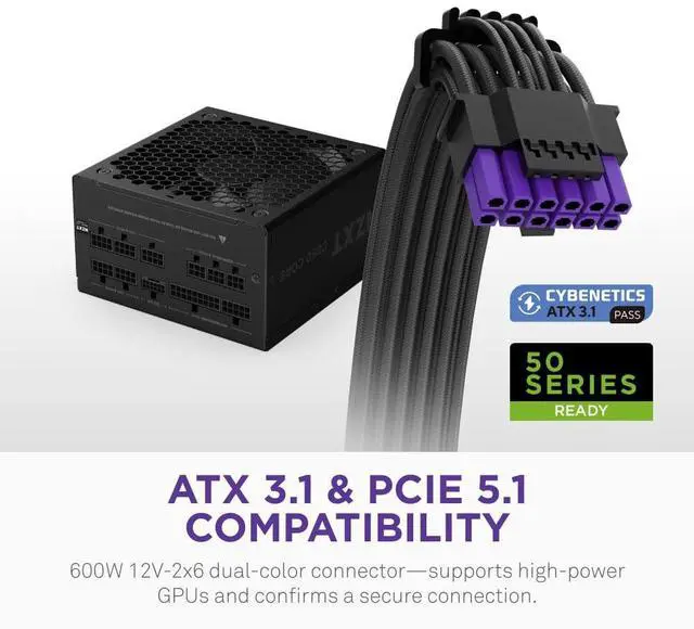 Delivers stable power with improved efficiency and voltage control - ideal for top-tier NVIDIA and AMD cards under heavy load. Ready for Any GPUSupports high-performance GPUs with a 12V-2x6 connector and dual-color housing that shows when the connection is secure. Includes up to three 8-pin PCIe cables for legacy support - offering flexibility across a wide range of powerful NVIDIA and AMD builds. Quiet When it Counts135 mm fluid dynamic bearing fan stays silent under light loads with Zero RPM mode-automatically stopping the fan when cooling isn't needed. Stable Under Pressure105 Degree C-rated capacitors deliver steady, reliable power-even under heavy loads.