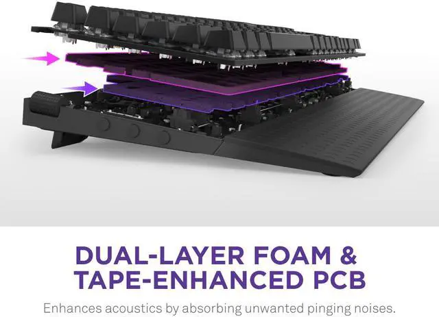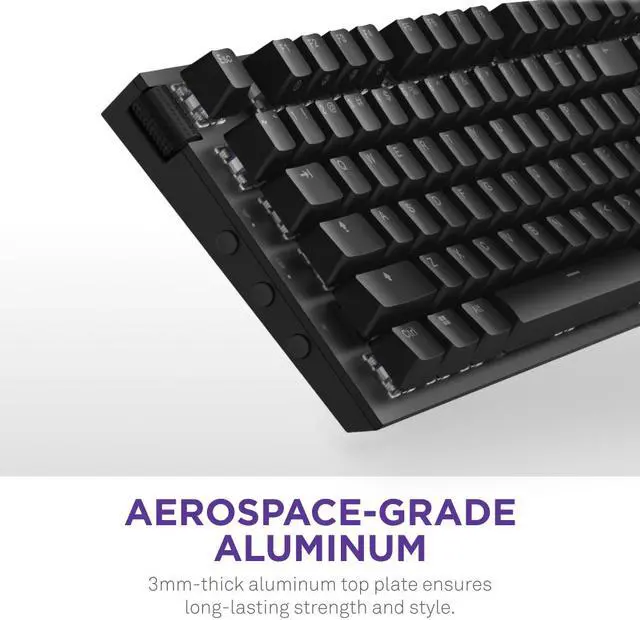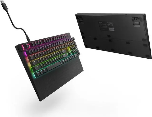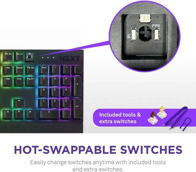 Crafted with doubleshot PBT keycaps, this keyboard boasts dual-layer plastic construction that prevents fading, ensuring long-lasting durability and a premium look. The dual-layer foam and tape-enhanced PCB are engineered to absorb unwanted pinging noises, significantly enhancing acoustics for a more immersive experience. Customization is at your fingertips with hot-swappable switches, allowing you to easily change switches anytime using the included tools and extra switches. The aerospace-grade 3mm-thick aluminum top plate not only adds a touch of style but also ensures robust durability for long-lasting performance. Tailor your gaming setup with the NZXT CAM software, which lets you personalize per-key RGB lighting and create custom profiles.