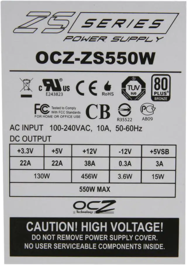 550W Continuous Power with Single Strong +12V RailThe OCZ ZS Series OCZ-ZS550W delivers 550W continuous power output rated at 40°C ambient temperature to deliver power as needed in a real world operating environment. Powerful single +12V rail at up to 38A design ensures the maximum provision of 12V power to energy-hungry CPU and VGA card perfect for future high-end component upgrades or overclocking.