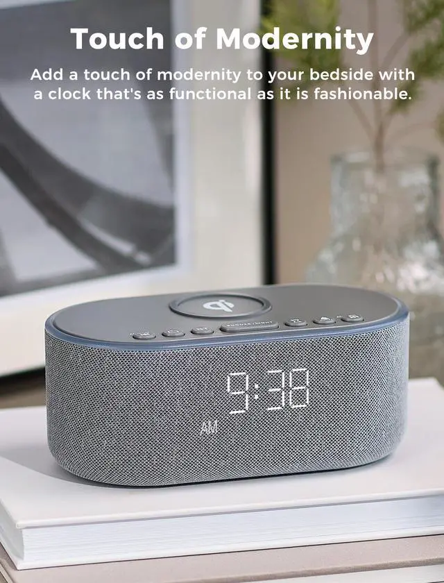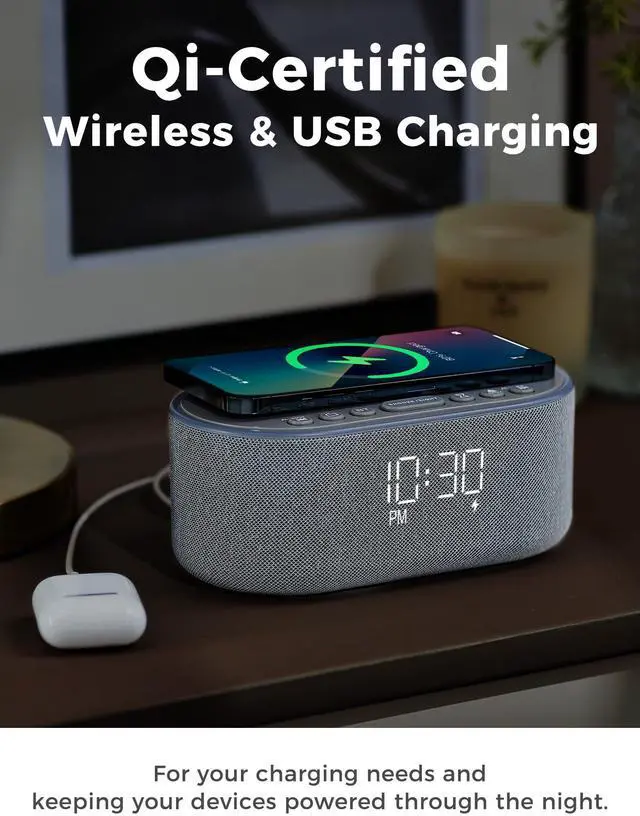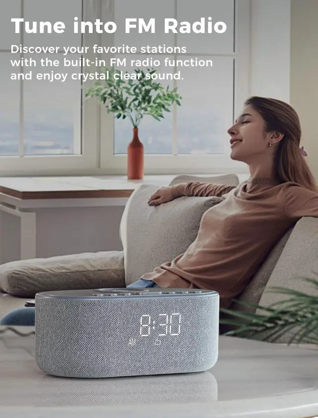 Beyond 8 built-in alarm sounds, you can set your favorite FM radio station as your wake-up sound.