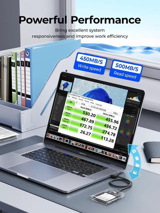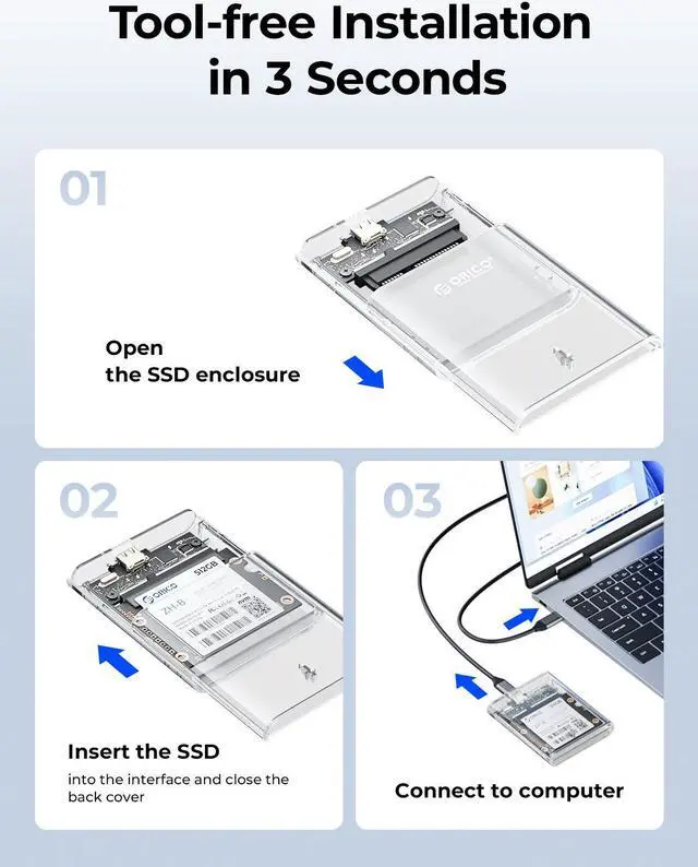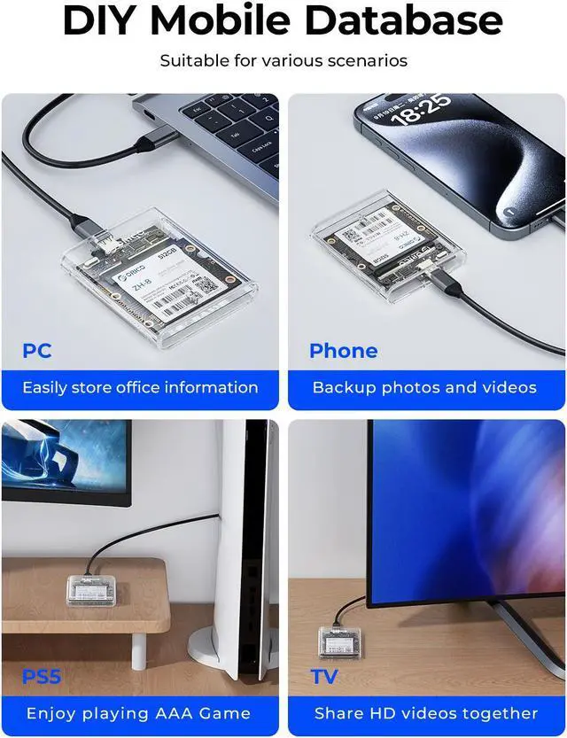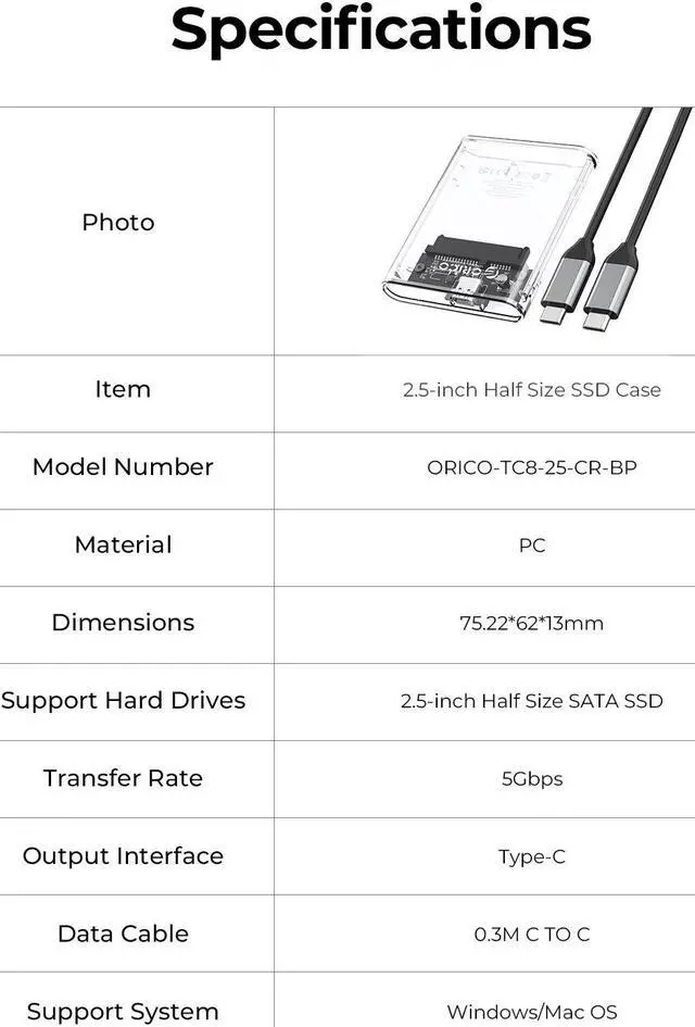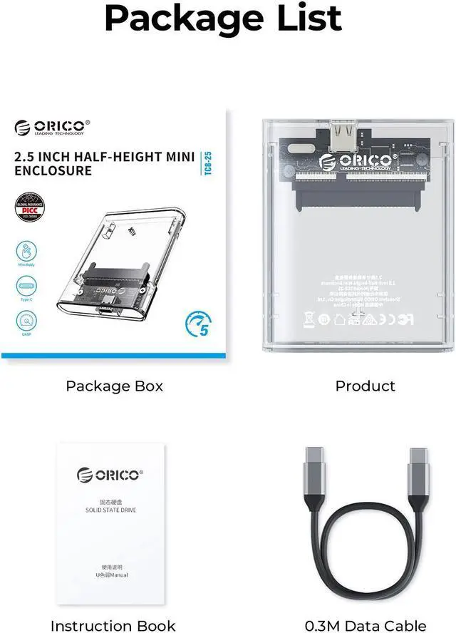 This product is a 5Gbps 2.5 -inch half-height hard drive enclosure. The overall appearance is made of transparent PC and is suitable for 2.5 -inch half-height SATA hard drives. Transparent technology style, high-quality workmanship and great hand feel. Tool-free installation is easy to operate, allowing users who disassemble old laptops to resurrect idle hard drives with full health