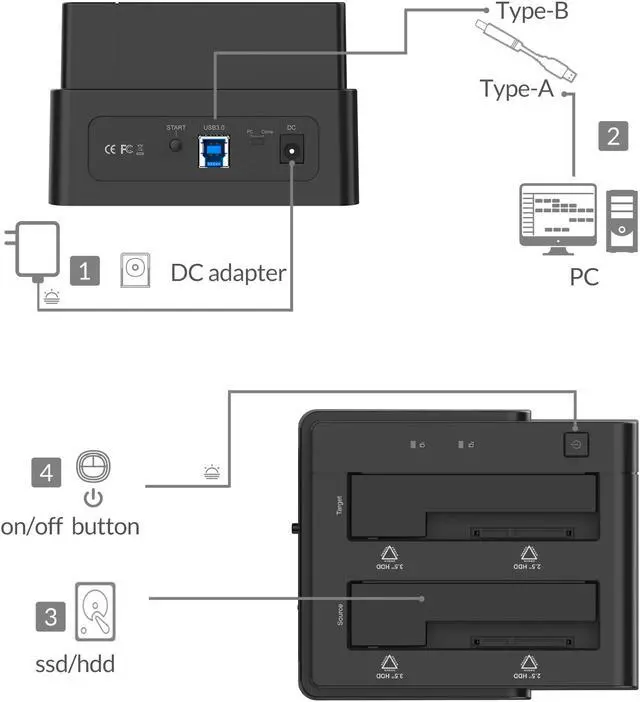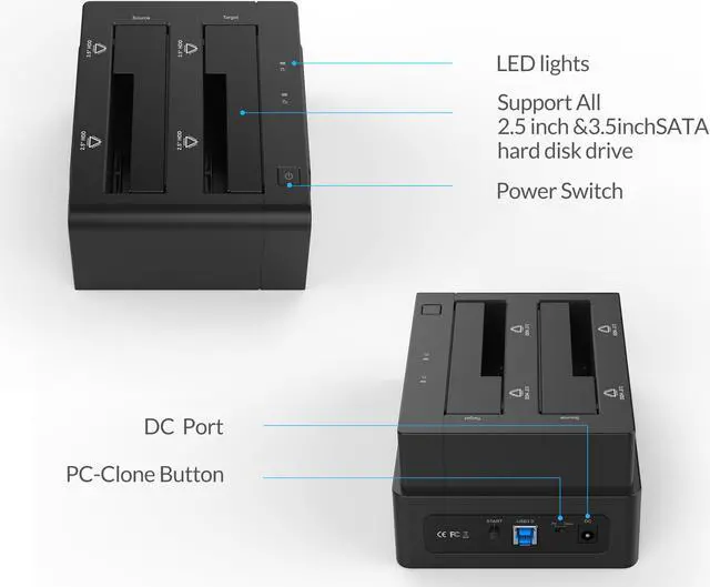 1 to 1 Clone; support 2.5 inch and 3.5 inch SATA HDD & SSD; compatible with Windows, Linux and Mac 9.1 or later
