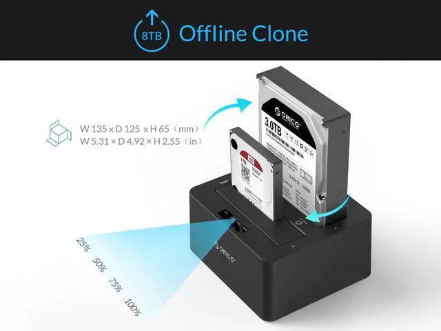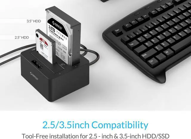 Compliable with 2.5 & 3.5 inch SATAI, II interface HDD & SSD (8TB Support), Tool Free installation, it allows users to mount 2 drives, you can always replace the disk spaces at the same time.