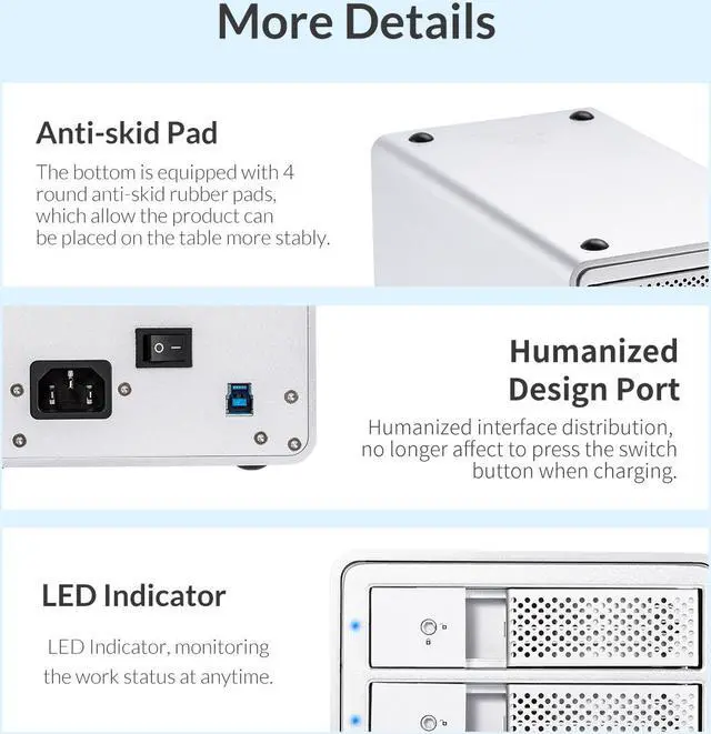 Features: External USB 3.0 output interface, support transfer rate up to 5Gbps; Supports intelligent sleep, (Idle for 10 minutes will automatically enter suspend mode), energy-saving, prolong the service life of hard drive; Tool-free design, only take 3-steps to install; Drive-free, support hot-swapping, plug and play; Equipped with keyhole and window-opening design to protect your data security; Adopts external 12V3A power adapter; Made of aluminum alloy material, sandblasted anodizing process, exquisite metal texture; Supports 32TB capacity; LED indicator, clearly monitoring work status of hard drive, blue light lights when power on and flashes when reading data. Compatible with Windows/Mac/Linux systems;