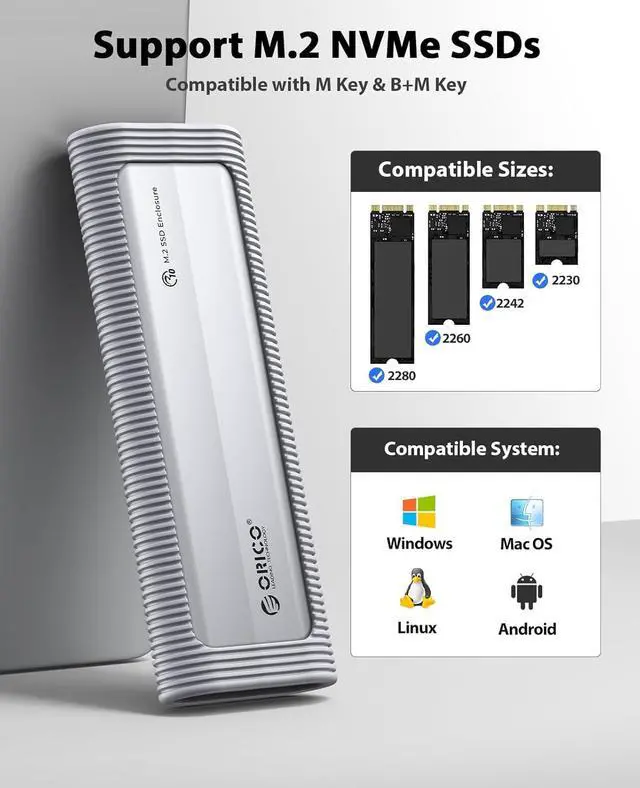 Compatible with multiple operating systemsORICO external hard disk box supports Windows/MacOS/Linux/ Android/Ios. And it's suitable for connecting computers, Smartphones, laptops, and other devices. Please note, all new solid-state drives must be formatted before use.