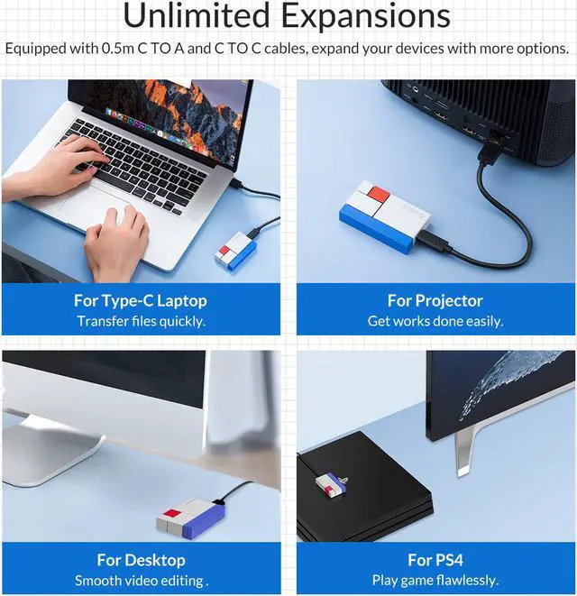 Equipped with 0.5m C TO A and C TO C cables, expand your devices with more options.