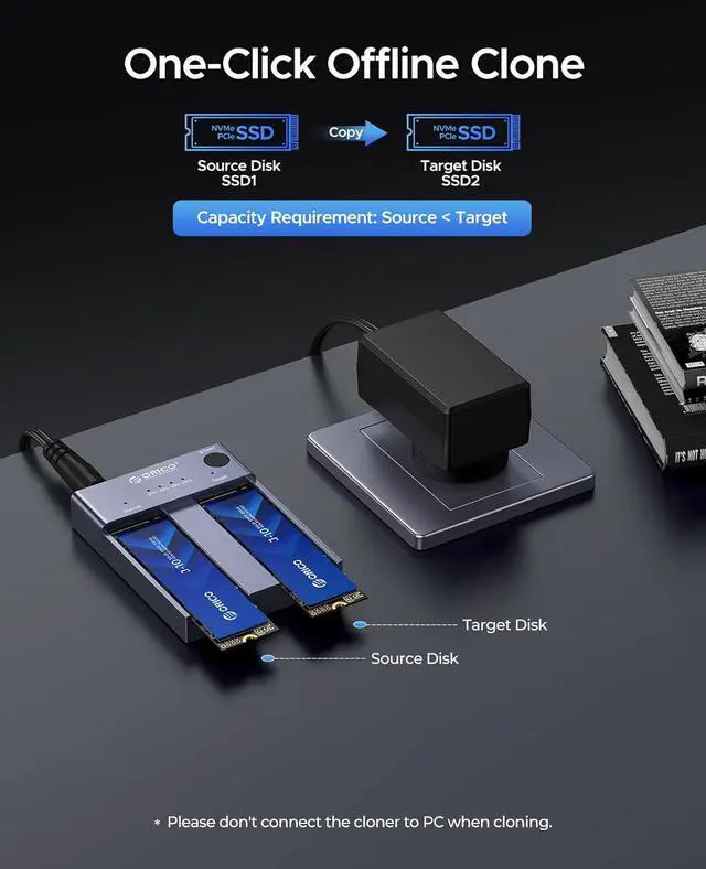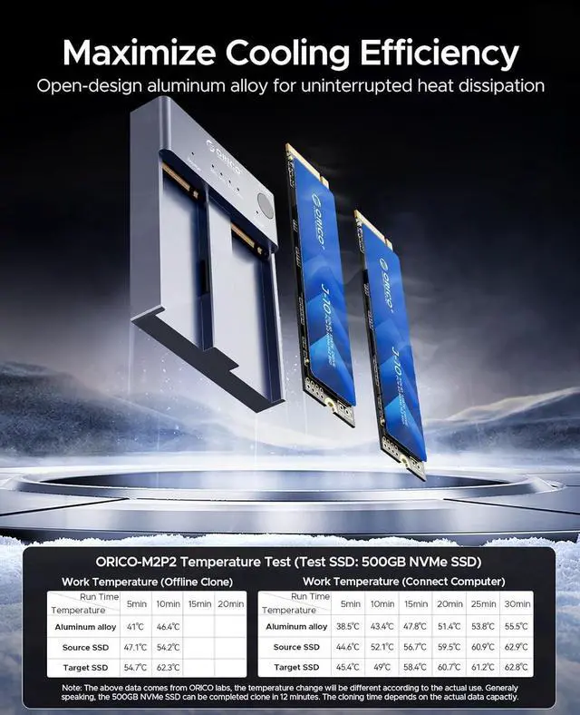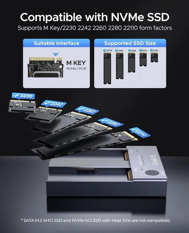 Wide Compatibility: The ORICO M.2 NVMe cloner supports M Key NVMe PCIe SSDs (22110/2280/2260/2242/2230) but is not suitable for SSDs with SATA or mSATA interfaces. It comes equipped with two silicone buckles and two thermally conductive silicone pads to securely hold the SSDs in place.