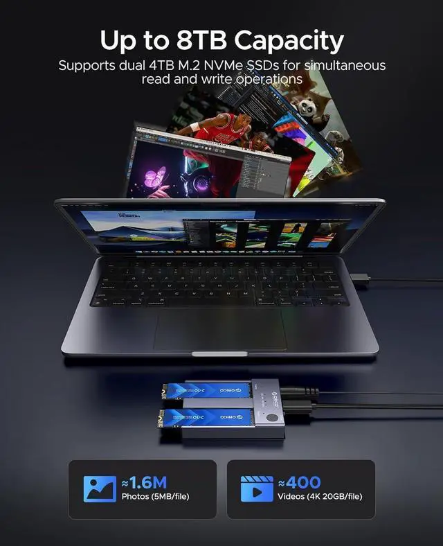 Flexible Storage Expansion: The dual-bay M.2 NVMe cloner and duplicator supports up to 8TB capacity, equivalent to two 4TB SSDs. Its mini NVMe docking station is approx