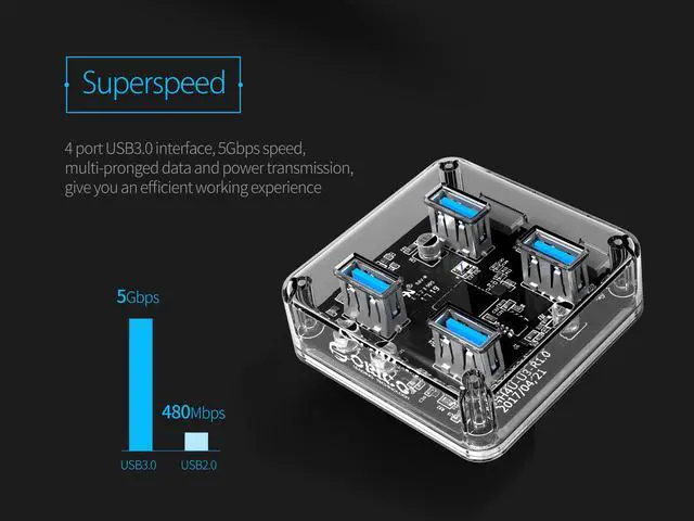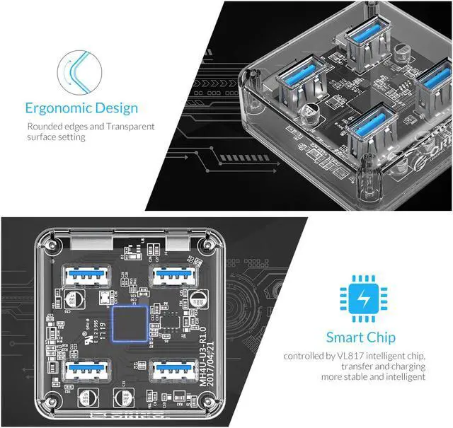 ORICO Creative Transparent HUB 4 Ports USB3.0 Super Speed with Reserced Micro USB3.0 External 5V Power Supply Support OTG Function 100cm USB Cable Optimised for PC Windows Linux Mac OS