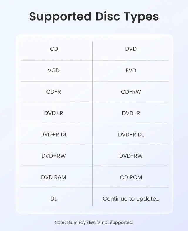 | Supported Disc | CD-R, CD ROM, CD+/-RW, DVD-RAM, DVD+/-R, DVD+/-RW, DVD+/-R DL | CD-R, CD ROM, CD+/-RW, DVD-RAM, DVD+/-R, DVD+/-RW, DVD+/-R DL | CD-R, CD ROM, CD+/-RW, DVD-RAM, DVD+/-R, DVD+/-RW, DVD+/-R DL | CD-R,CD-RW ,DVD-R,DVD-RW,BD-R TL/QL,BD-R SL/DL,BD-ROM, BD-RE SL/DL, BD-RE TL | CD-R,CD-RW ,DVD-R,DVD-RW,BD-R TL/QL,BD-R SL/DL, BD-ROM,BD-RE SL/DL, BD-RE TL |