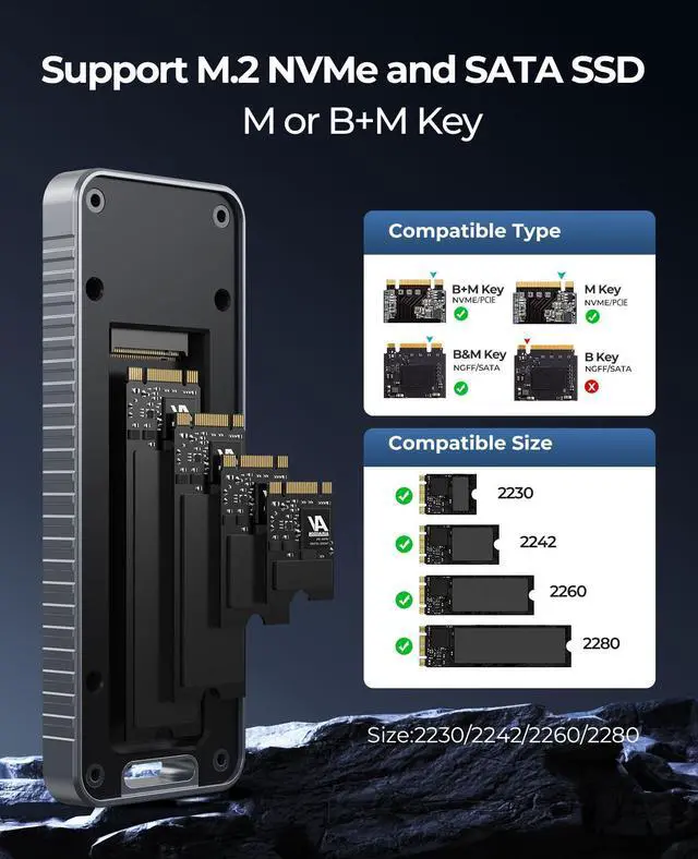 Supports NVME and SATA dual protocols, with transmission speeds up to 10Gbps and maximum capacity up to 4TB.