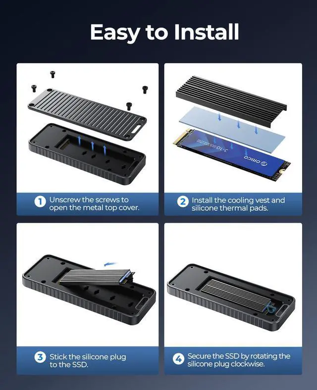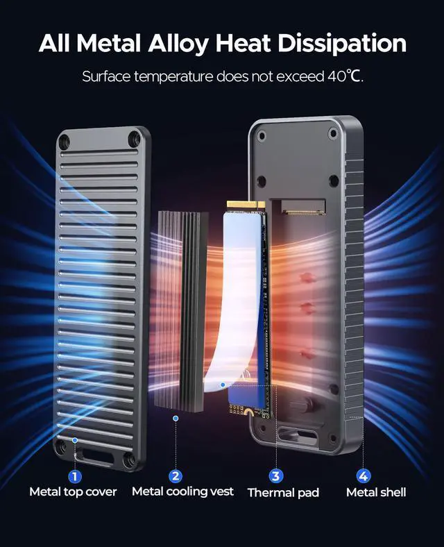 Supports NVMe (PCIe) / SATA (NGFF) SSD, full stripe body design, the fastest data transmission speed can reach 10Gbps, the maximum capacity supports 4TB, equipped with C/A to C 2-in-1 Data Cable, including cooling vest.